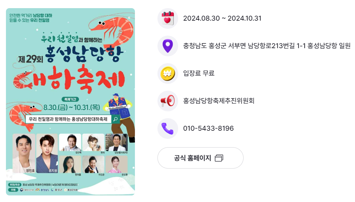 | 홍성군 | 남당항 대하축제 | 8.30.(금) ~ 10.31.(목) | 홍성 남당항 일원 |