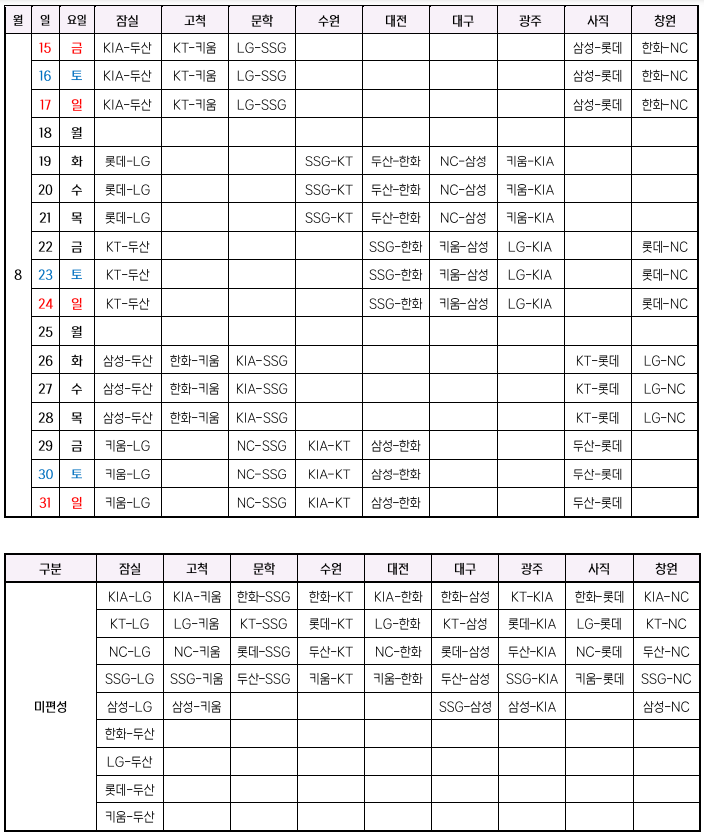 ▶ 개막 2연전과 올스타전 휴식기 직후의 4연전을 제외한 모든 경기가 3연전으로 편성되어, 8월 31일(일)까지 팀당 135경기가 우선 편성되었습니다. 미편성된 45경기(팀당 9경기)는 우천 등으로 취소되는 경기와 함께 추후 편성될 예정입니다.