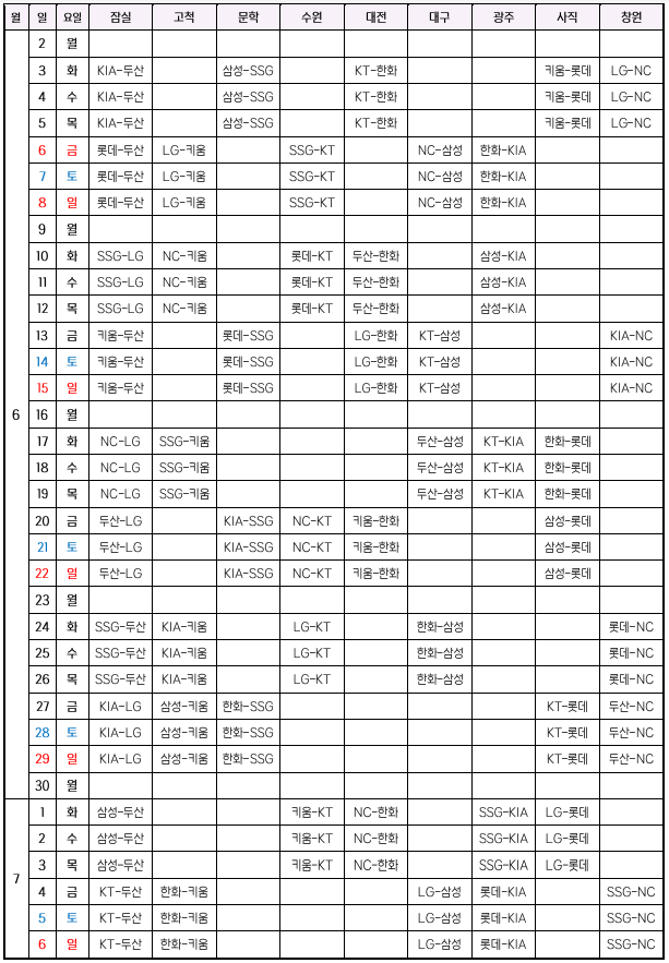| 일정 | 잠실 | 고척 | 대전 | 사직 | 창원 |