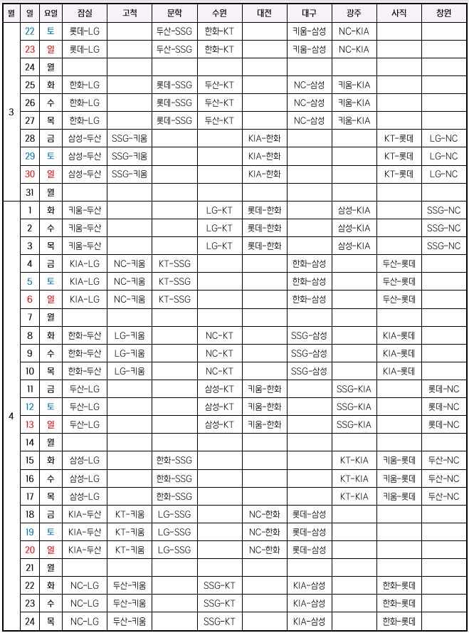 | 3월 22일(토) | 롯데-LG | 두산-SSG | 한화-KT | 키움-삼성 | NC-KIA |