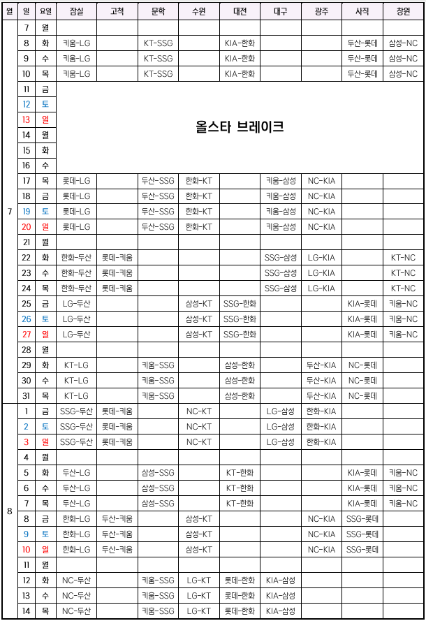 ▶ 올스타전 휴식 기간은 7월 11일(금) ~ 16일(수)까지로 기존 4일에서 6일로 확대되었습니다. 정규시즌 후반기는 7월 17일(목)부터 4연전으로 시작됩니다.