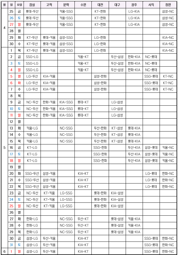 | 5월 5일(월) | LG-두산 | KIA-키움 | 삼성-한화 | SSG-롯데 | KT-NC |